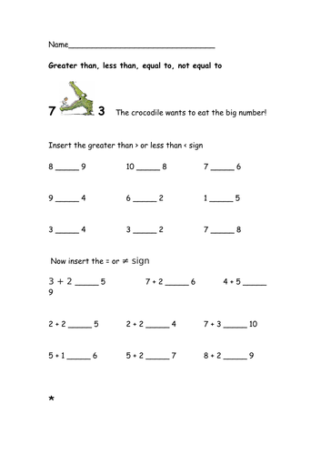 2nd Grade Math Worksheets: Greater Than, Less Than, Equal To 2nd Grade Math Worksheets: Greater Than, Less Than, Equal To Hungry Man (mine) - 5 worksheets that get a bit more difficult. Great for one week of 2nd grade math practice! Alligator Numbers - Super Teacher Worksheets has quite a few. If you are a member, the options are more, but there are enough freebies that it isn't necessary.